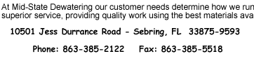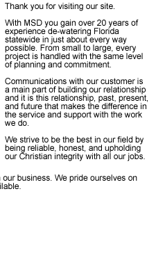 With MSD you gain over 20 years of experience dewatering Florida statewide in just about every way possible. From small to large, every dewatering project is handled with the same level of planning and commitment. We use the latest dewatering equipment Removal of stormwater and wastewater is a major job at some sites. We serve most all of florida including sebring lake placid, avon park, orlando lorida, okeechobee, and tampa. Dewatering and florida go hand in hand. Dewatering systems can be a heavy investment but will often provide lower sludge an require less containers and boxes. We are based in Sebring Florida but deliver our dewatering equipment all over florida. Stormwater can cause great problems with containers at job sites if not collected by a propper dewatering system. Some dewatering system remove aditional stormwater. Communications with our customer is a main part of building our relationship and it is this relationship, past, present, and future that makes the difference in the service and support with the work we do. Using dewater technologies makes many work sites safe. We follow all codes not limited too but including orlando and tampa. We dewater in lorida, sebring, avon park, and more. We strive to be the best in our field by being reliable, honest, and upholding our Christian integrity with all our jobs.